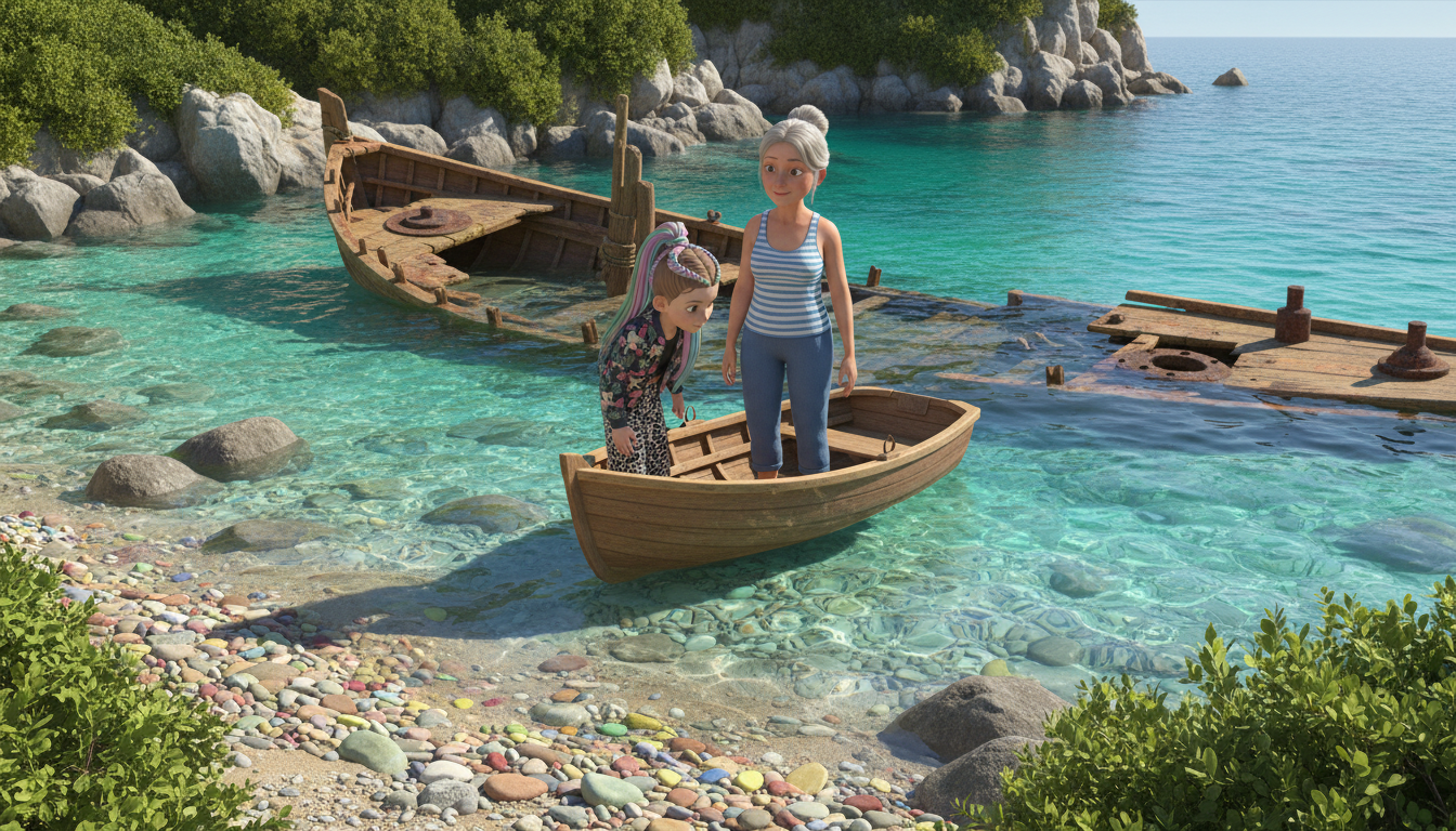 Тітка Софія обережно підвела човен до мілкої бухти. Вода тут була настільки прозора, що можна було бачити піщане дно. Частина затонулого судна виднілася з-під води. Дерево було потемнілим, а деякі частини вкриті водоростями. "Це він! "Морський Спів"!" – прошепотіла Емілія. Кролик схвильовано кинувся до борту, щоб краще роздивитися. "Пам'ятайте про правила, діти!" – нагадала тітка Софія.