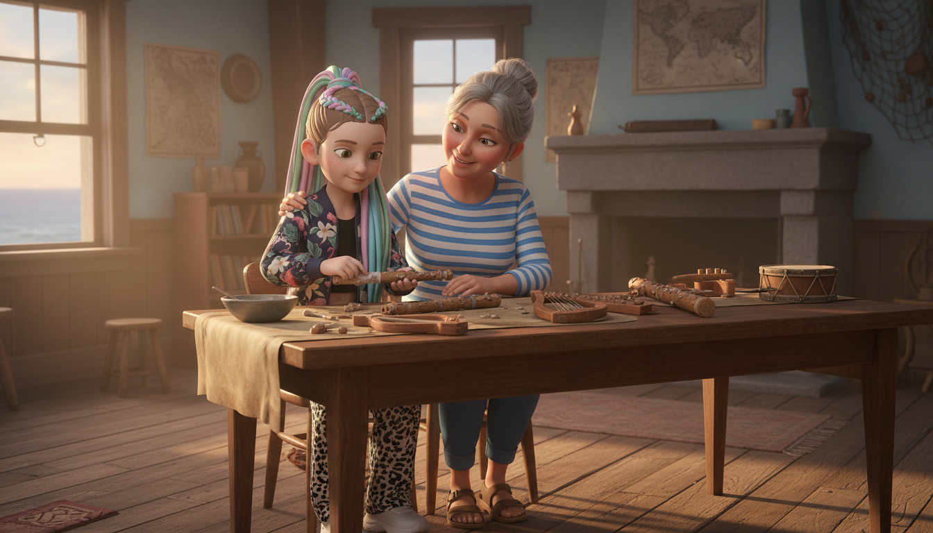 Емілія, під пильним наглядом тітки Софії, обережно опустила руки у воду. Вона відчула холодок, але її серце билося від хвилювання. "Я бачу щось!" – сказала вона. Повільно, крок за кроком, вона дістала з води кілька предметів. Це були старі музичні інструменти: флейта, кілька труб та маленька арфа, покриті черепашками та водоростями. "Ми знайшли їх!" – радісно вигукнула Емілія.
